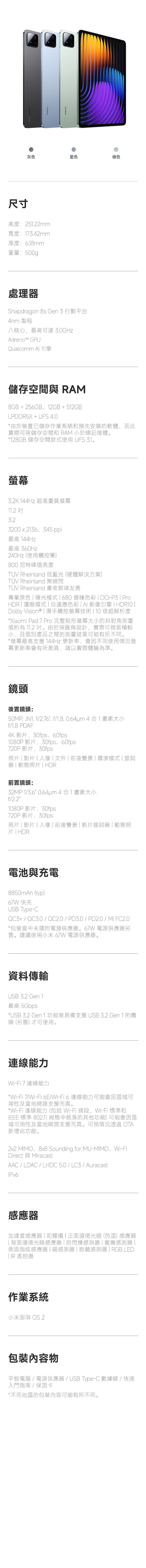 | 商品名稱 | Xiaomi Pad 7 Pro 三色 12GB RAM 512GB ROM |
