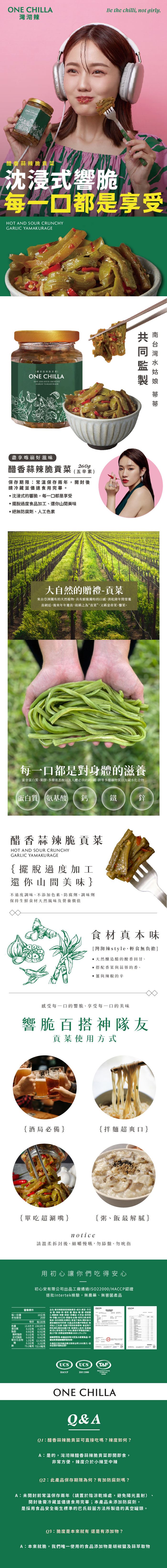 | 內容物(完整成份/食品添加物) | 貢菜、芥花油、醋、辣椒、蒜、香菜、醬油、糖、鹽、胡椒鹽(L-麩酸鈉、食鹽、胡椒)、棕櫚油、大豆油、蒜萃取物 |