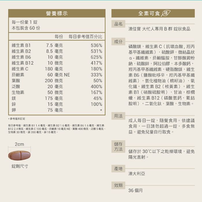 | 商品名稱 | 【限量贈洗手慕斯】澳佳寶Blackmores 大忙人專用B群 60錠x2瓶 |