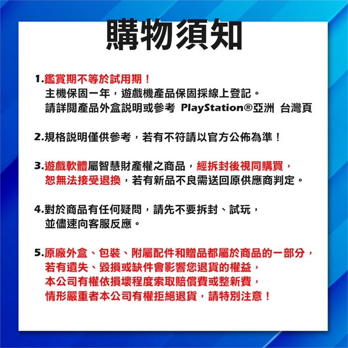 | ※封條外包膜經撕開毀損後無保固天數,將無法退換貨。 ※商品僅七天鑑賞期非試用期,七日內退貨須保持商品完整包含封口貼。 ※七日內新品不良仍需原廠檢驗,非人為因素且商品配件無異常方可後續處理。 ※七日內新品不良退換貨需保留商品所有配件包含防塵袋、束帶、防撞材...等。 ※拆封過程請配合錄影以保障買賣雙方權益,若有異常請即時向客服反應。 ※光碟軟體屬智慧財產權之商品,拆封後恕不接受退換貨。 ※原廠保留解釋及無事先通知情況下變更內容或規格之權利。 |