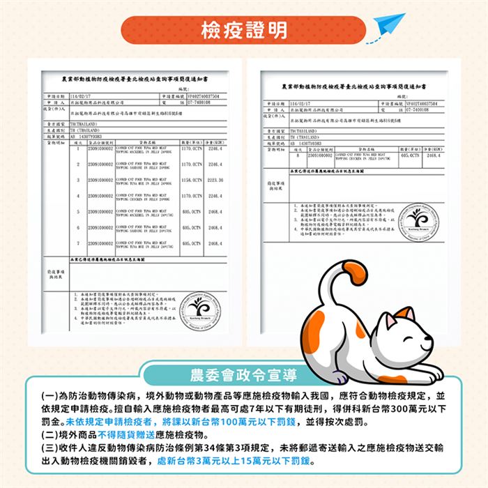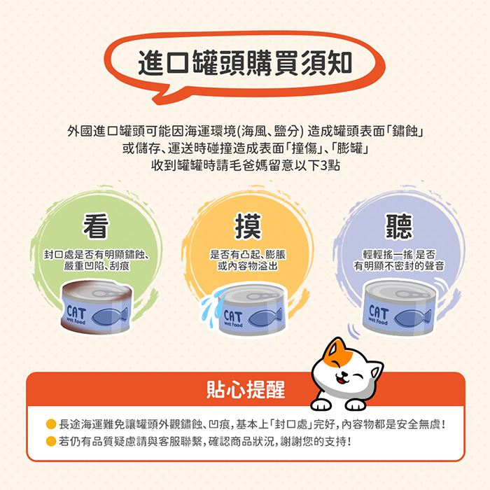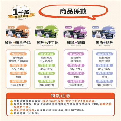 | 注意事項 | ※此寵物罐頭僅作為副食用,每天還是要攝取足夠全營養主食。但可以搭配食用,減少餵食成本或攝取的卡路里。 ※拉環時請小心割傷。請勿微波此商品 ※請放置於陰涼乾燥、兒童無法觸及之處。 |