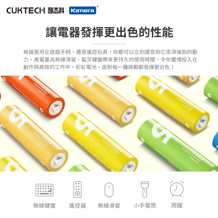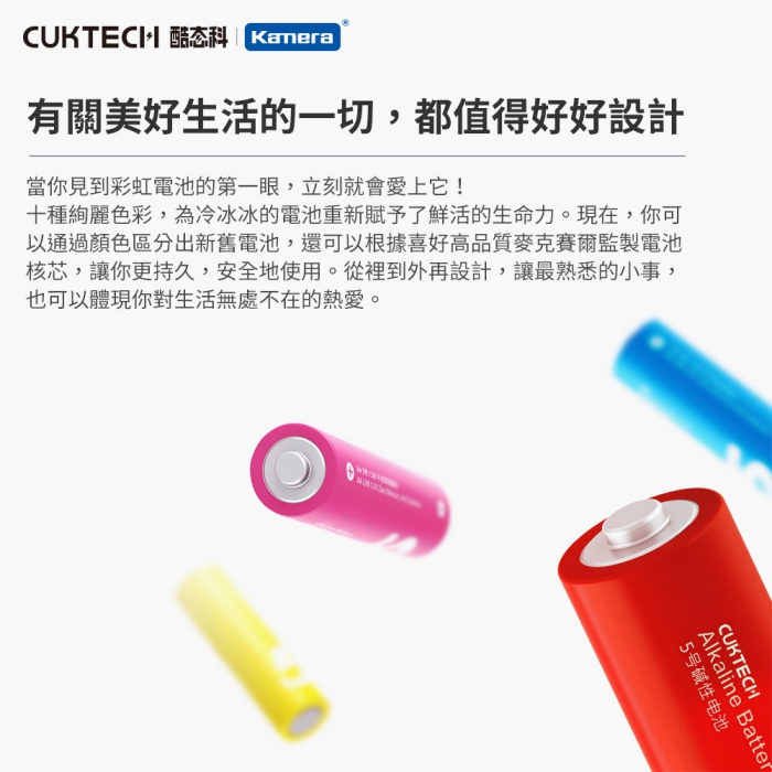 - 鹼性電池與傳統的碳性電池相比,因化學成分及結構的不同,使電池本身更小,容量更大,更適合長時間、大電流的輸出。多種色彩的絢麗組合,讓您換電池可以依照喜好或心情變換色彩,或者是不同電器搭配不同的顏色。使用環保設計,無毒安全又可以讓生活更美好!
