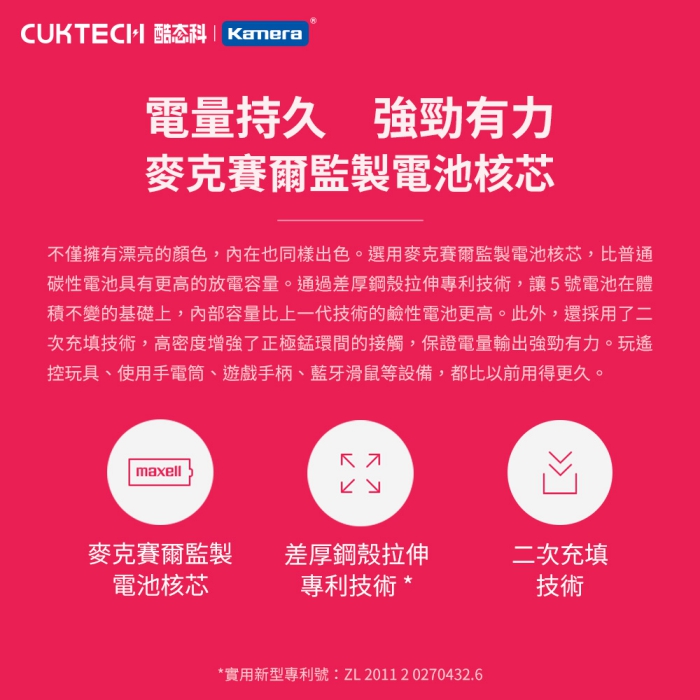 - 麥克賽爾監製電池核心,比普通碳性電池具有更高的放電容量。