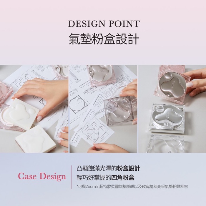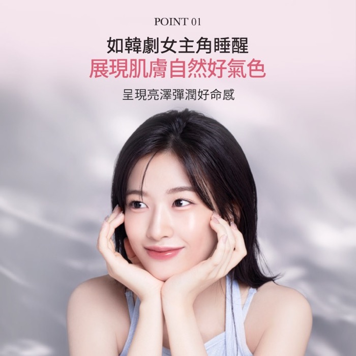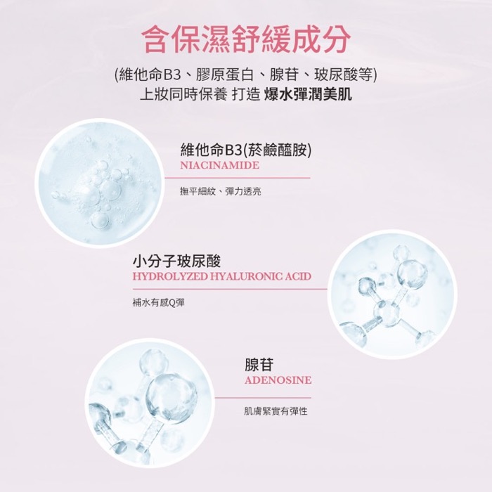 - 保濕舒緩,上妝保養並行:添加膠原蛋白、腺苷、維他命B3、玻尿酸等保濕舒緩成分,上妝同時保養,使皮膚呈現睡飽覺的自然彈潤光澤。