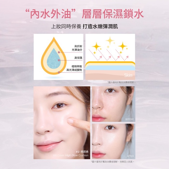 - 質地""內水外油"",展現柔亮好氣色:輕輕一拍,肌膚彈潤水嫩,自帶完美天使光圈,打造爆水亮澤好氣色及澎潤好命感。