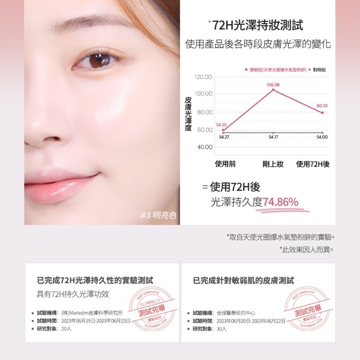 - 72H長效持妝,輕薄高遮瑕: 經實驗測試可達72小時持妝;亦通過敏弱肌測試,敏弱肌也適用。