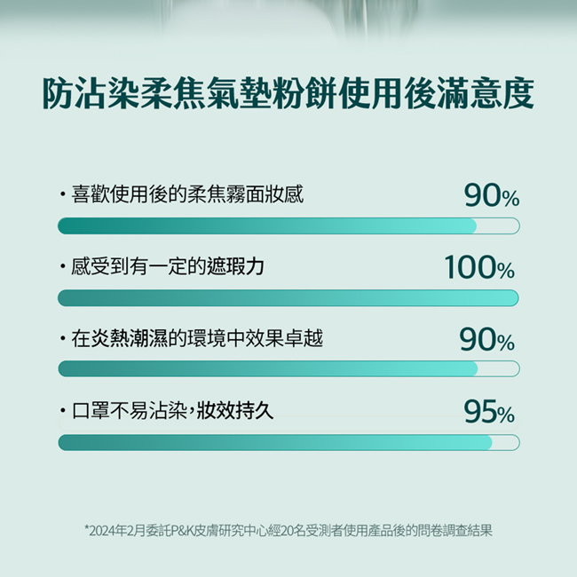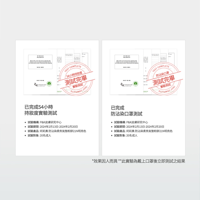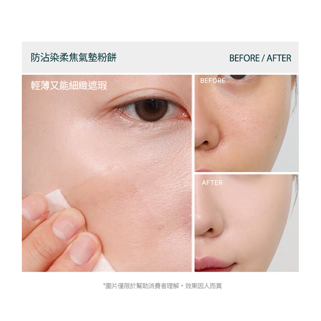 - 54H持妝x高遮瑕,快速成膜速乾定妝:一拍速乾,擺脫氣墊粉餅惱人的黏膩感,且經實驗證實有54H持妝及防沾染效果。