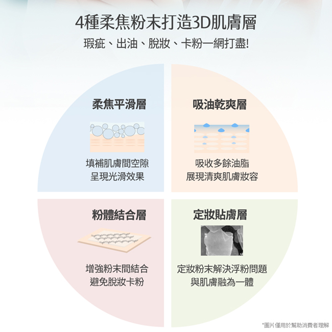 - 定妝貼膚層:定妝粉末解決浮粉問題,細緻服貼度高,與肌膚融為一體!