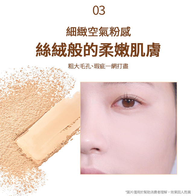 - 內含玻尿酸成分,保濕親膚不乾澀:如原生皮膚般輕薄服貼,就像第二層肌膚一樣舒適,一拍打造柔嫩妝感。