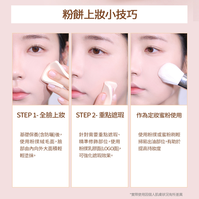 | 使用方法 | 基礎保養後使用內附粉撲輕按粉餅沾取適量底妝輕輕拍打於全臉並於需要遮瑕的部位加強輕拍;可用於上妝或補妝。 |