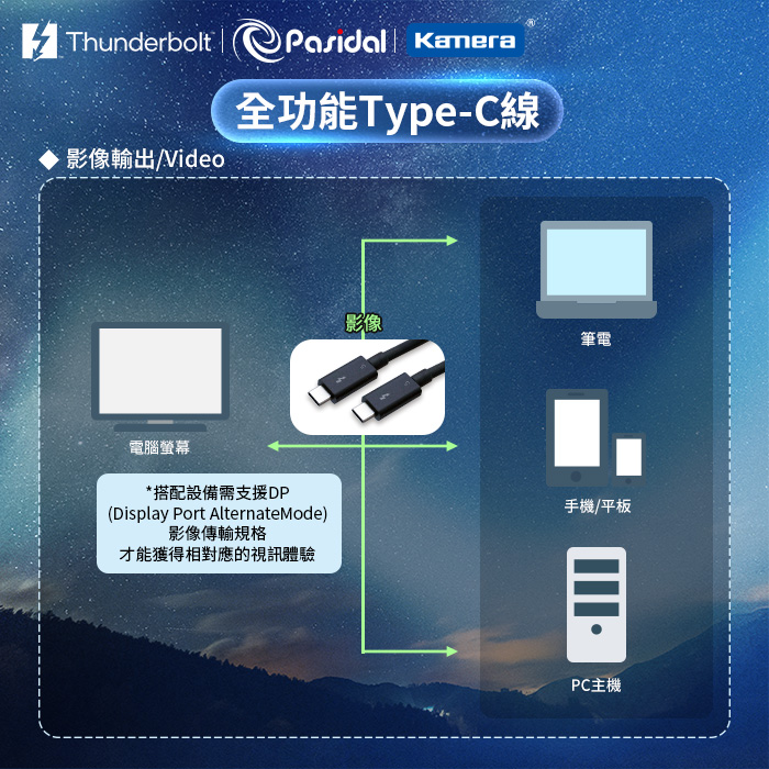 - 支援DP2.1,4通道DisplayPort影音訊號傳輸,DP替代模式。