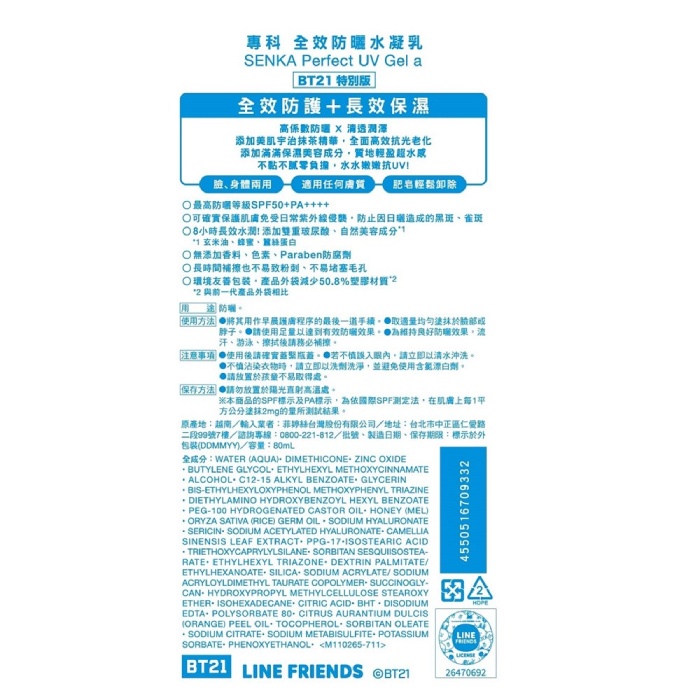 | 商品名稱/包裝內容規格 | 專科全效防曬水凝乳80ml/瓶-BT21特別版 |