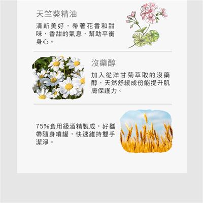 | 成分 | 酒精、月桃萃取液、大馬士革玫瑰精油、玫瑰天竺葵精油、真正薰衣草精油、廣藿香精油、玫瑰草精油、沒藥醇、薑精油 |