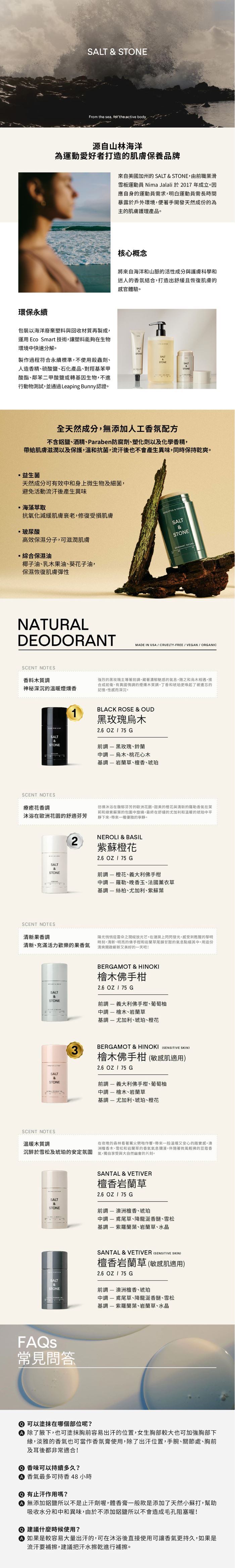 全天然成份,值得一提的是,SALT & STONE 體香膏全面不添加市面上止汗膏常見成分「鋁鹽」不避擔心毛囊阻塞而引起肌膚發炎問題,也不擔心致敏。