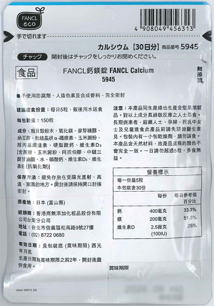 | 商品名稱 | FANCL 芳珂 鈣鎂錠 30日份 150粒/包 [2包組] |