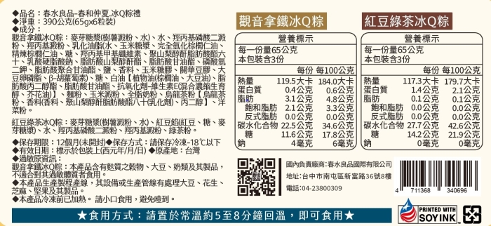 | 包裝內容/商品規格 | 390公克(65gx6粒装)(觀音拿鐵冰Q粽*3粒+紅豆綠茶冰Q粽*3粒) |