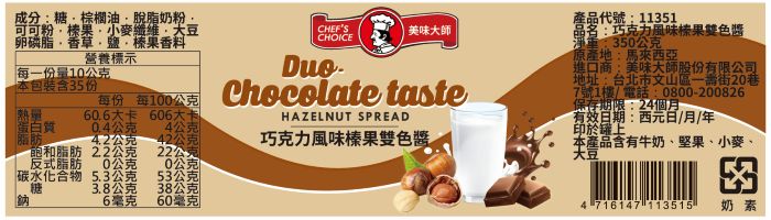 | 商品名稱 | 美味大師巧克力風味榛果雙色醬350g |