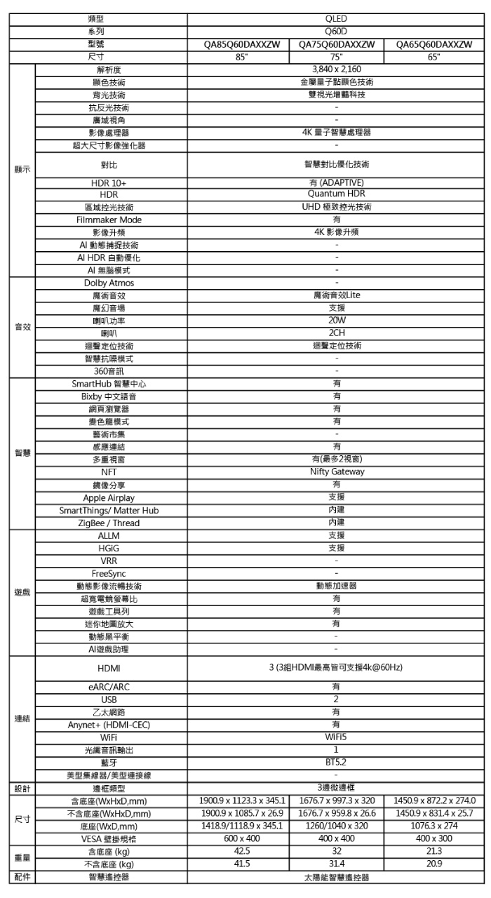 | 內容物 | SAMSUNG 65吋QLED液晶顯示器 QA65Q60DAXXZW |