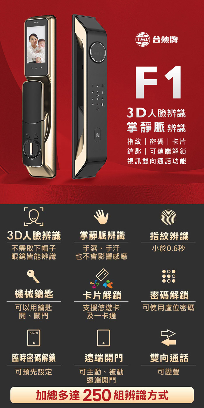 ◆商品:TEW台熱牌 8合1推拉式電子鎖(F1)(掌靜脈/人臉/指紋/密碼/卡片/鑰匙/APP遠端開門/雙向通話)(附基本安裝)