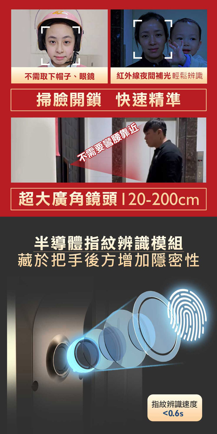 ◆140度超廣角鏡頭不必彎腰或墊腳,針對不同身高設計皆能快速偵測,120公分-200公分完全不需要彎腰靠近,1秒即可解鎖。