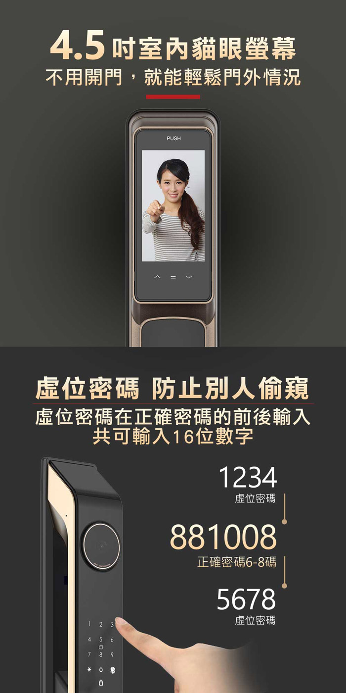 ◆4.5吋貓眼高解析IPS大螢幕,長按螢幕上方觸碰鍵可喚醒螢幕查看門外狀況。