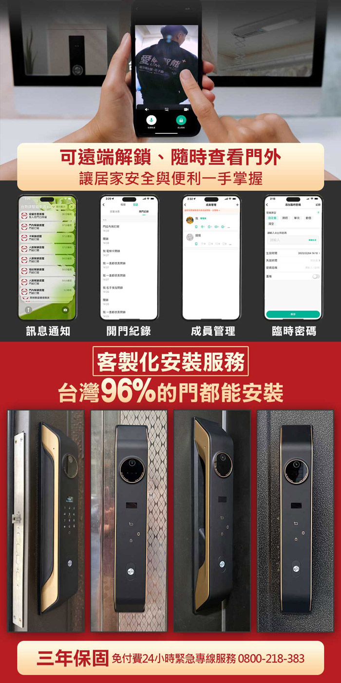 ◆利用手機APP連接家中WIFI,可即時查看開門紀錄及警告並查看門外狀況,透過APP可設定成員、臨時密碼等。