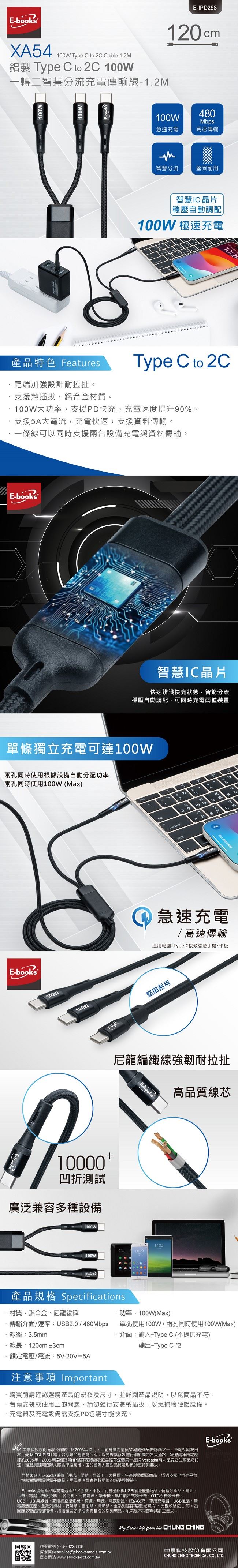 | 【商品名稱】 | E-books XA54 鋁製Type C to 2C 100W 一轉二智慧分流充電傳輸線-1.2M |