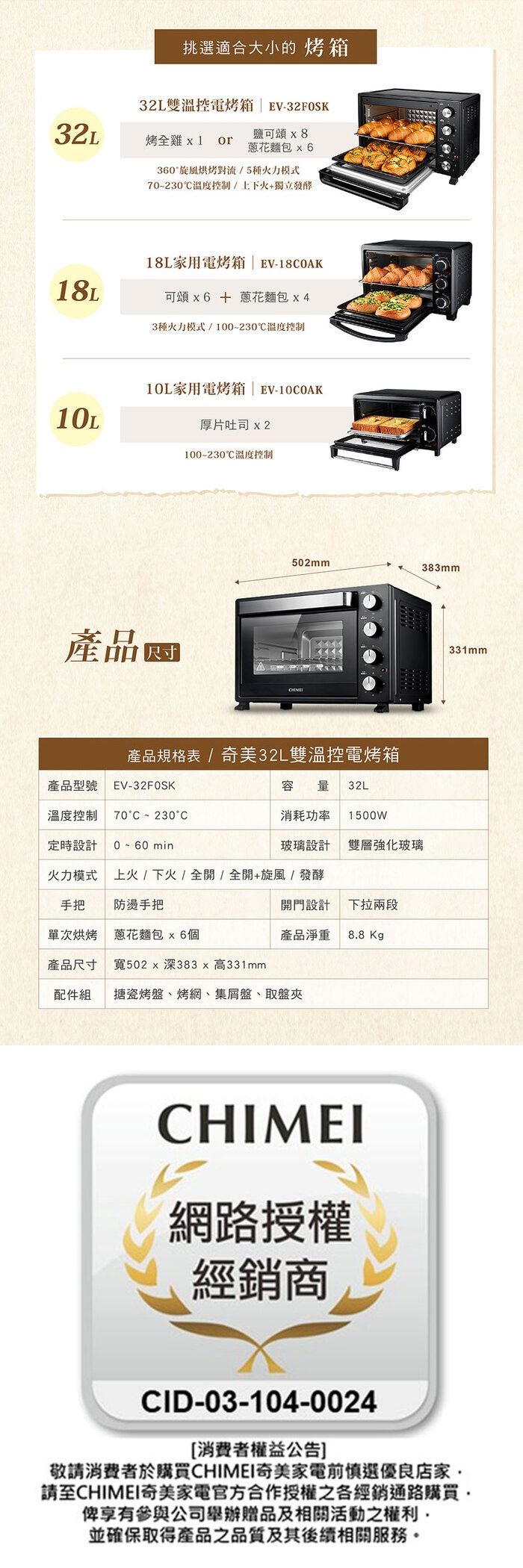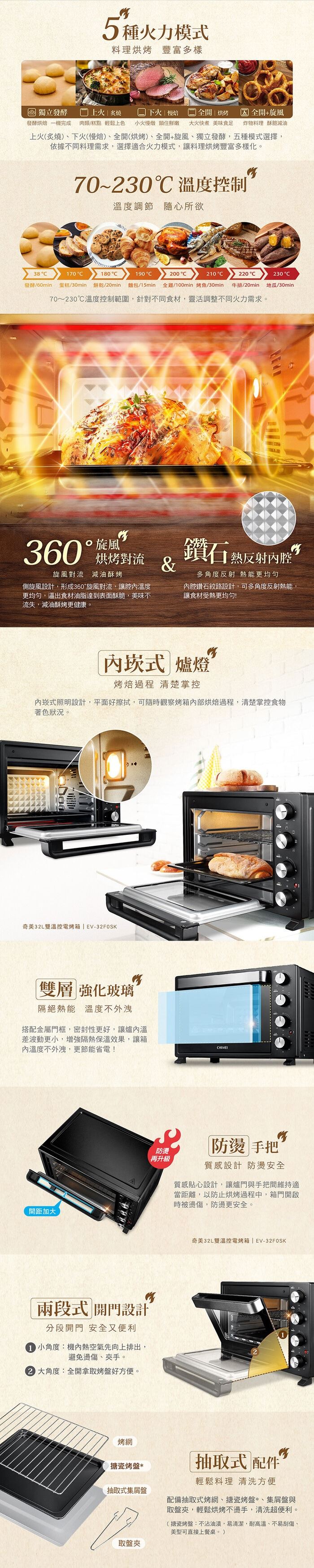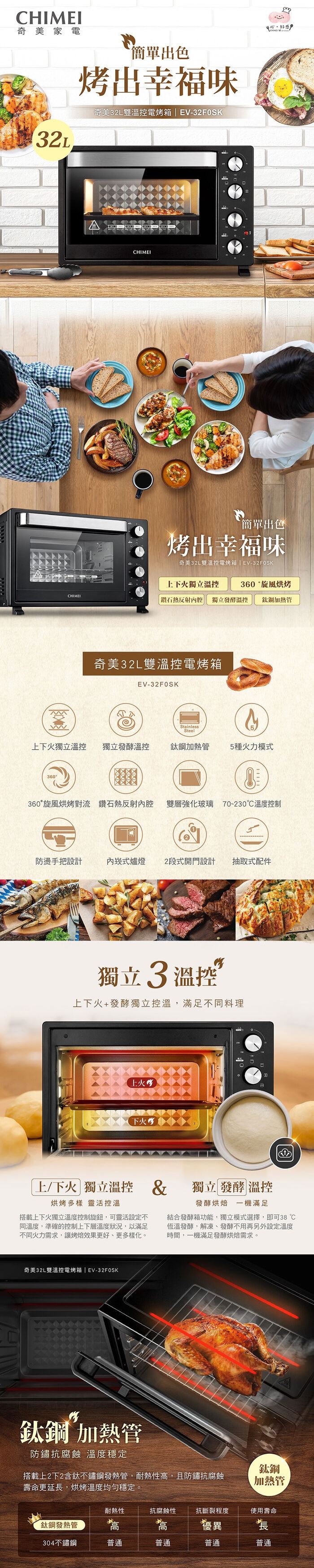 | 商品名稱 | 【CHIMEI奇美】32L雙溫控360度旋風烘烤獨立發酵電烤箱 EV-32F0SK |