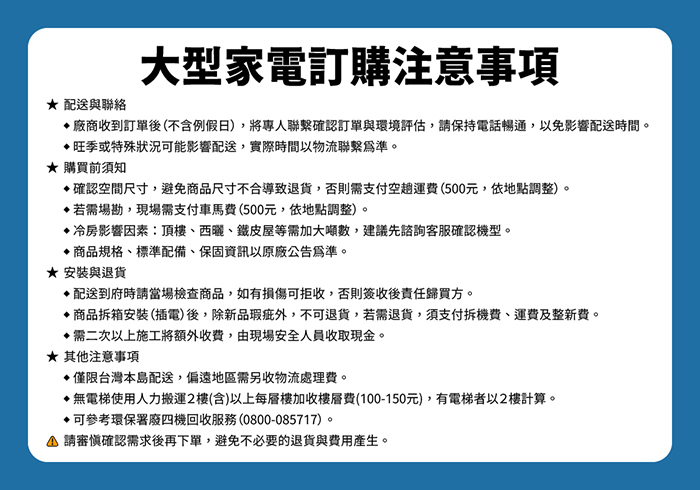 | 保固說明 | 全機7年保固/壓縮機10年保固。本公司之家電產品轉為營業用途或場所(如出租套房、學生宿舍等、工廠、政府機關或公共場所等)全機含壓縮機,基板,冷媒系統,視訊盒等...保固一年。特殊環境如硫磺,油酸,鹽害,沼氣,廢氣,不明氣體等因素產生腐蝕生鏽所引起故障及漏冷媒所導致者,保證期間本公司酌收材料工本費。 |