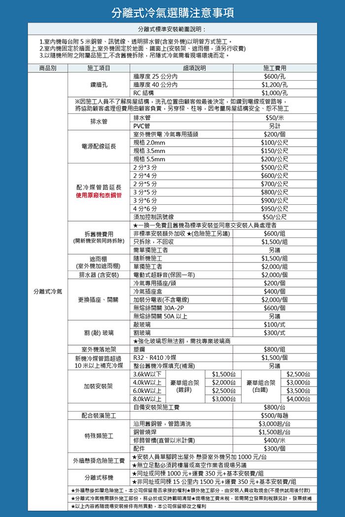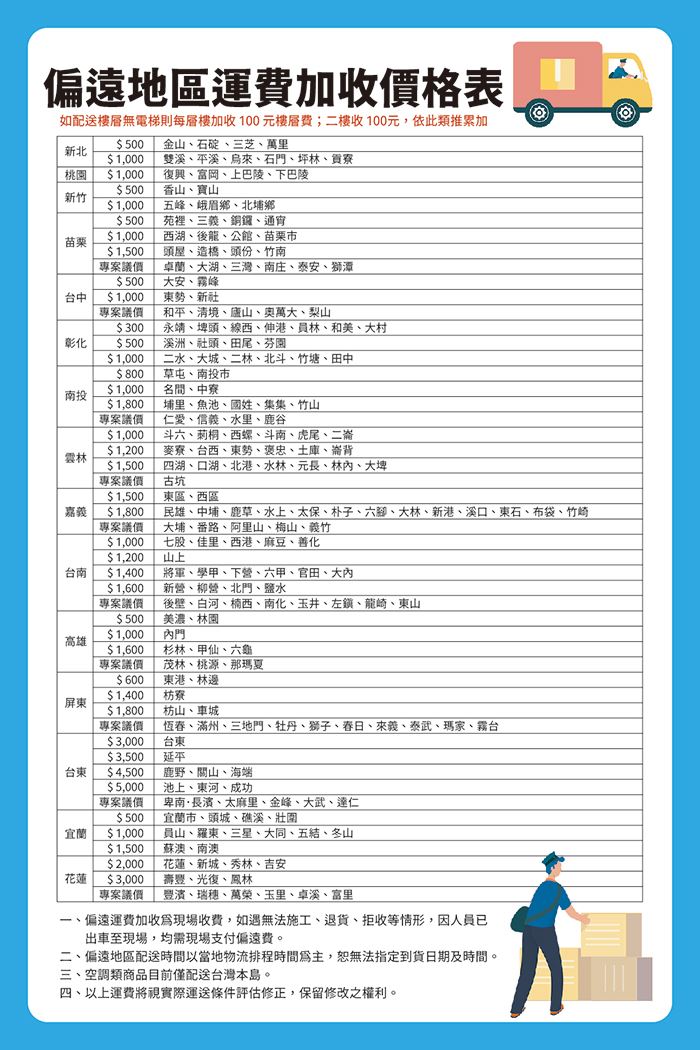 | 保固說明 | 全機7年保固/壓縮機10年保固。本公司之家電產品轉為營業用途或場所(如出租套房、學生宿舍等、工廠、政府機關或公共場所等)全機含壓縮機,基板,冷媒系統,視訊盒等...保固一年。特殊環境如硫磺,油酸,鹽害,沼氣,廢氣,不明氣體等因素產生腐蝕生鏽所引起故障及漏冷媒所導致者,保證期間本公司酌收材料工本費。 |