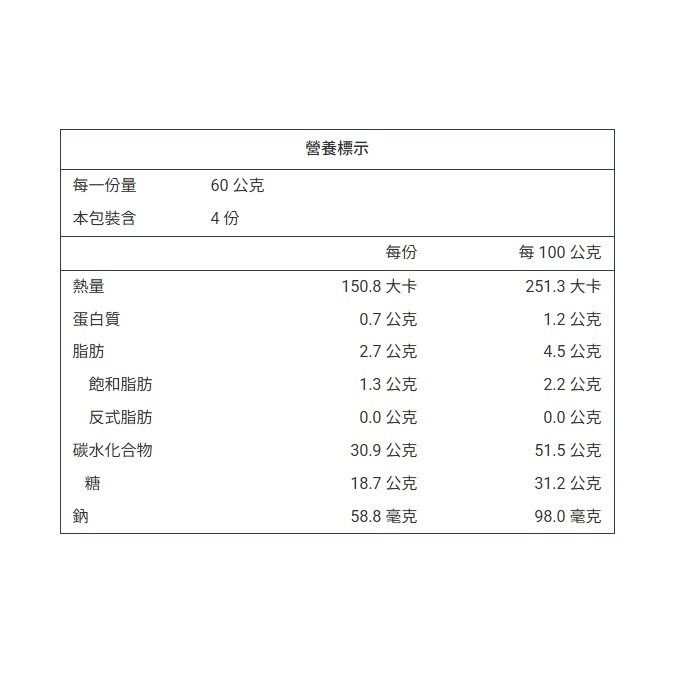 | 包裝內容/商品規格 | 60g*4入/包、共6包/箱 |