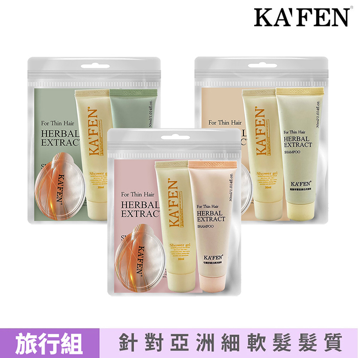 | 商品名稱/包裝內容規格 | KAFEN 卡氛 療癒草本系列旅行組(洗髮精30ml+沐浴乳30ml+髮膜12ml) x 3組 [艾草/龍膽草/芍藥 - 3款擇1款出貨] |