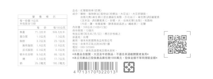 ◉ 過敏原資訊:本產品含麩質、大豆及牛奶製品,不適合其過敏體質者使用