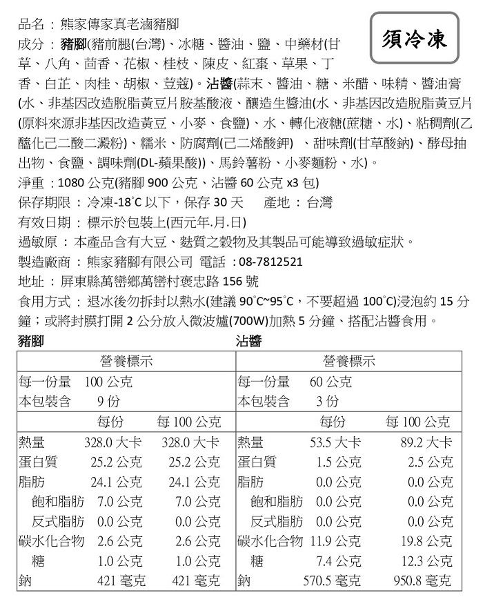 | 商品名稱 | 【熊家】萬巒豬腳8包(900g/包) |