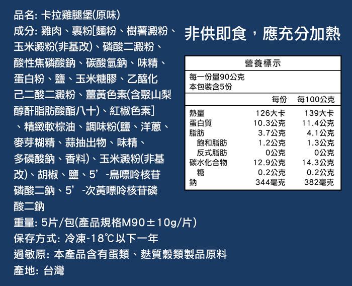 | 商品名稱 | 【築地一番鮮】卡拉雞腿排(原味)30片(90g±10g/片) |