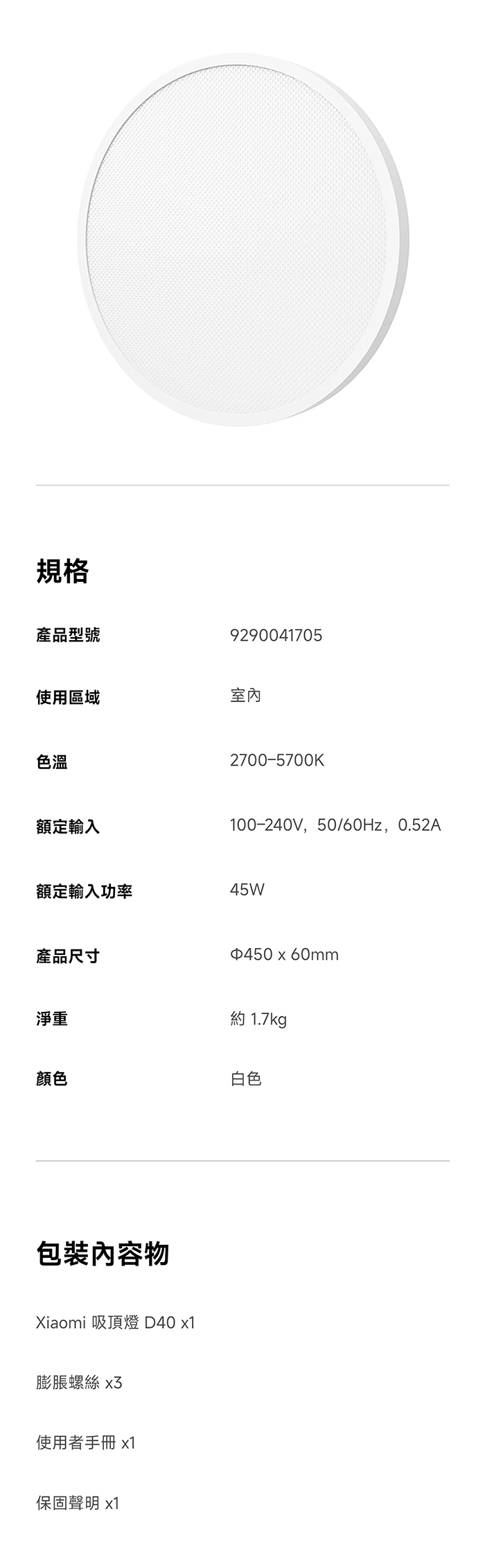 | 內容物 | Xiaomi 吸頂燈 D40 x1 膨脹螺絲 x3 使用者手冊 x1 保固聲明 x1 |