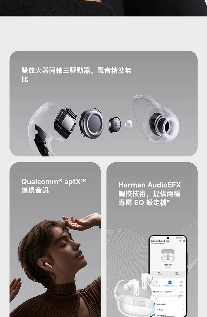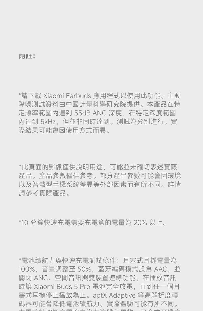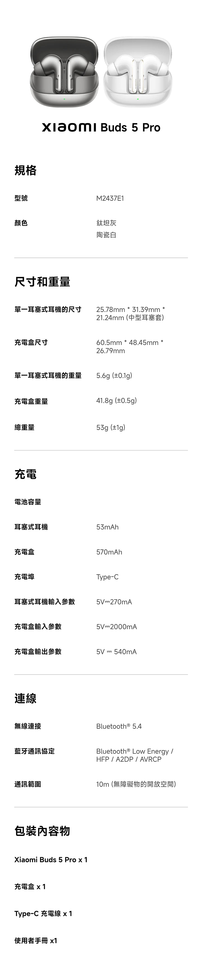 | 內容物 | Xiaomi Buds 5 Pro x 1 充電盒 x 1 Type-C 充電線 x 1 使用者手冊 x1 |