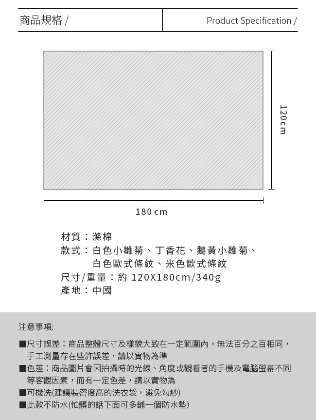 款式: 白色小雛菊、丁香花、鵝黃小雛菊、白色歐式條紋、米色歐式條紋 尺寸/重量: 約 120X180cm/340g |