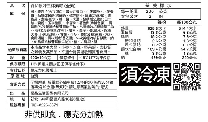 | 商品名稱 | 【祥和蔬食】原味三杯素粽20顆(2顆/包) |