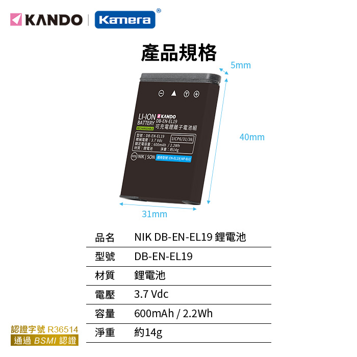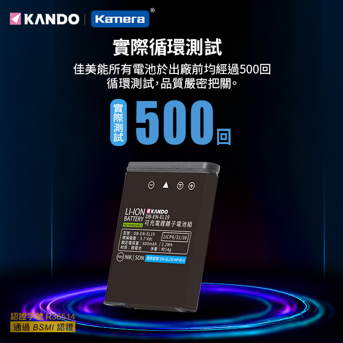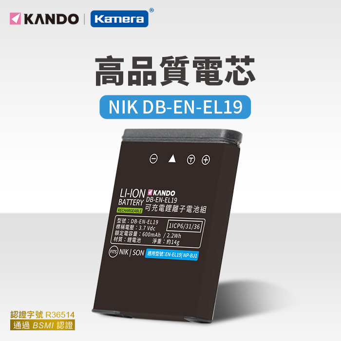 | 【商品名稱或型號】 | 【Kamera】Nikon EN-EL19 & Sony NP-BJ1 相機鋰電池 BSMI認證 |