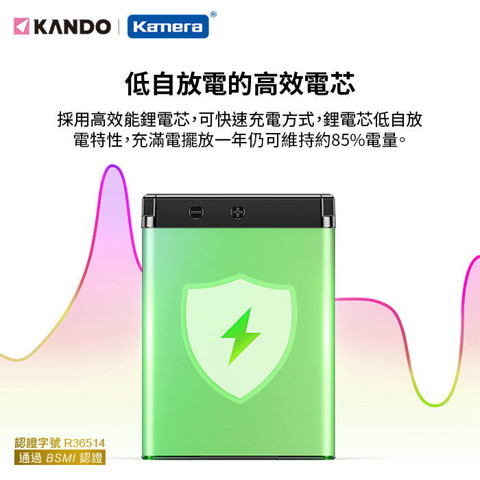 - 低自放電的高效電芯;採用高效能鋰電芯,可快速充電方式,鋰電芯低自放電特性,充滿電擺放一年仍可維持約85%電量。