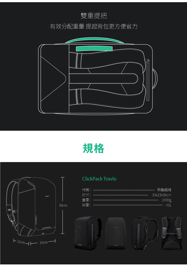 | 內容物 | ClickPack Travlo 45L後背大容量旅行防盜逸行包*1、背包雨衣*1 |