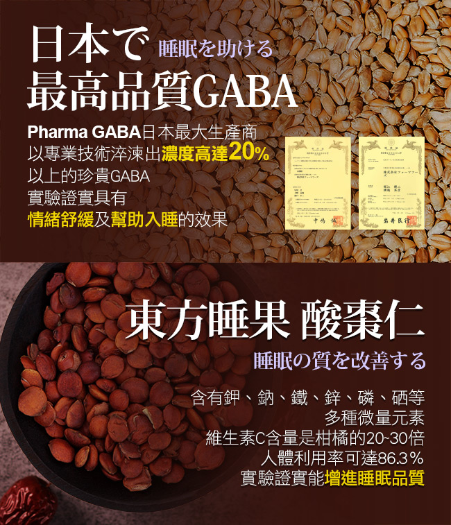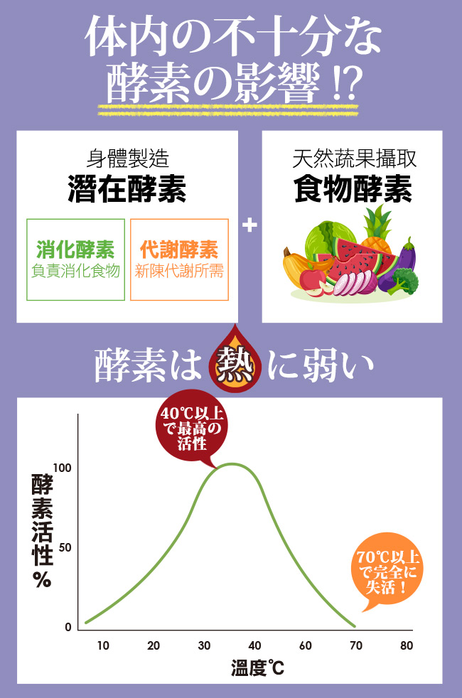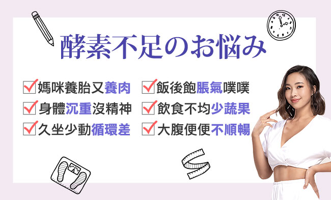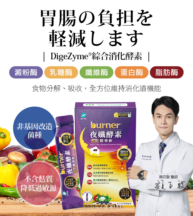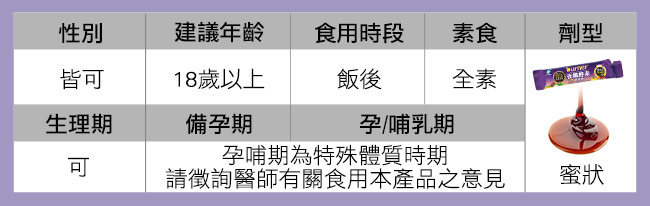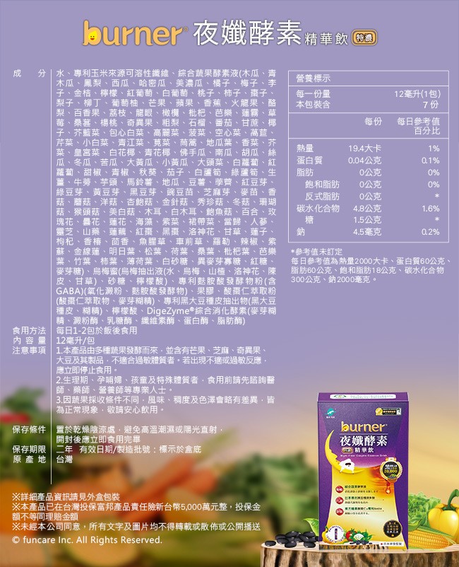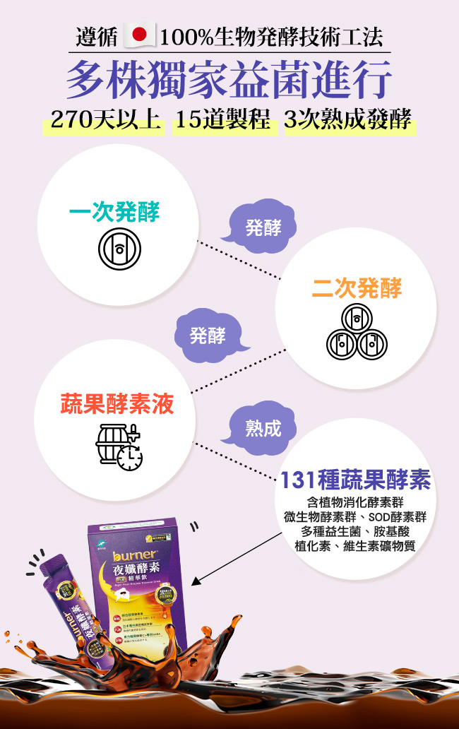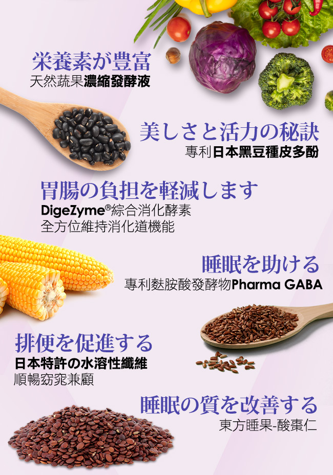 | 內容物 (完整成份/食品添加物) | 水、專利玉米來源可溶性纖維、綜合蔬果發酵液(木瓜、青木瓜、鳳梨、西瓜、哈密瓜、美濃瓜、橘子、梅子、李子、金桔、檸檬、紅葡萄、白葡萄、桃子、柿子、棗子、梨子、柳丁、葡萄柚、芒果、蘋果、香蕉、火龍果、酪梨、百香果、荔枝、龍眼、橄欖、枇杷、芭樂、蓮霧、草莓、桑葚、楊桃、奇異果、石榴、番茄、甘蔗、椰子、芥藍菜、包心白菜、高麗菜、菠菜、空心菜、萵苣、芹菜、小白菜、青江菜、莧菜、茼蒿、地瓜葉、香菜、芥菜、皇宮菜、白花椰、青花椰、佛手瓜、南瓜、胡瓜、絲瓜、冬瓜、苦瓜、大黃瓜、小黃瓜、大頭菜、白蘿蔔、紅蘿蔔、甜椒、青椒、秋葵、茄子、白蘆筍、綠蘆筍、生薑、牛蒡、芋頭、馬鈴薯、地瓜、豆薯、荸薺、紅豆芽、綠豆芽、黃豆芽、黑豆芽、豌豆苗、芝麻芽、麥苗、香菇、蘑菇、洋菇、杏鮑菇、金針菇、秀珍菇、冬菇、珊瑚菇、猴頭菇、美白菇、木耳、白木耳、鮑魚菇、百合、玫瑰花、曇花、蓮花、海藻、紫菜、裙帶菜、當歸、人蔘、靈芝、山藥、蓮藕、紅棗、黑棗、洛神花、甘草、蓮子、枸杞、香椿、茴香、魚腥草、車前草、羅勒、辣椒、紫蘇、金線蓮、明日葉、松葉、荷葉、桑葉、枇杷葉、芭樂葉、竹葉、柿葉、薄荷葉、白砂糖、異麥芽寡糖、紅糖、麥芽糖)、烏梅蜜(烏梅萃取液、砂糖、仙楂抽出液(山楂、甘草、洛神花、陳皮)、香料、檸檬酸、焦糖色素)、專利麩胺酸發酵物(含GABA)、果膠、酸棗仁萃取物、專利黑大豆種皮抽出物(黑大豆種皮、糊精)、檸檬酸、DigeZyme®綜合酵素(麥芽糊精、α-澱粉酶、乳糖酶、纖維酶、中性蛋白酶、脂肪酶) |