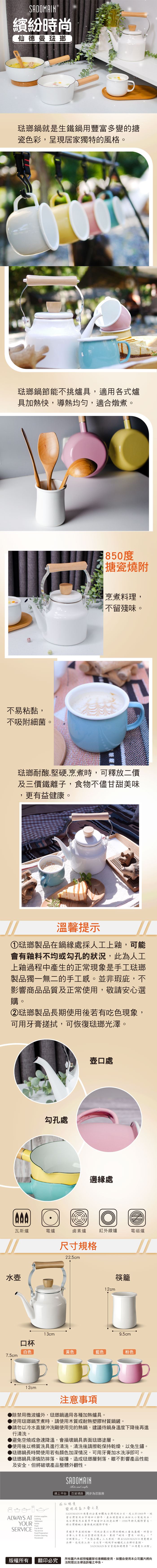 | 注意事項 | ● 琺瑯產品皆為人工塗料,在塗覆琺瑯層時,不易上釉料的邊緣及把手部分,可能會有釉料不均或是釉料較薄的地方,因此若有不均勻的現象,乃為手工琺瑯產品獨一無二的特色,並不影響產品正常效能,可放心使用。 ● 除禁用微波爐外,琺瑯鍋適用各種加熱爐具。 ● 使用琺瑯鍋烹煮時,請使用木質或耐熱塑膠材質鍋鏟。 ● 請勿以冷水直接沖洗剛使用完的熱鍋,建議待鍋身溫度下降後再進行清洗。 ● 避免空燒或急速降溫,會損壞鍋具表面琺瑯塗層。 ● 使用後以棉質洗具進行清洗,清洗後請擦乾保持乾燥,以免生鏽。 ● 琺瑯鍋長時間使用若有顏色加深情況,可用牙膏加水洗淨即可。 ● 琺瑯鍋具須慎防摔落、碰撞,造成琺瑯層剝落,雖不影響產品性能及安全,但將破壞產品整體外觀性。 ● 琺瑯鍋具使用一段時間後,若有表面吃色狀況,並不影響正常功能,可用牙膏進行擦拭保養,恢復琺瑯原色。 |
