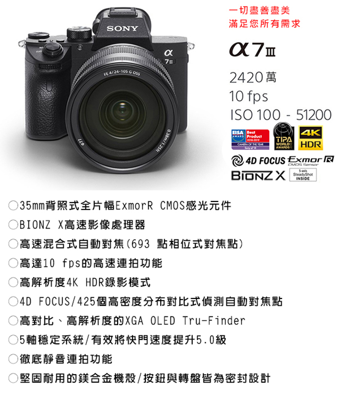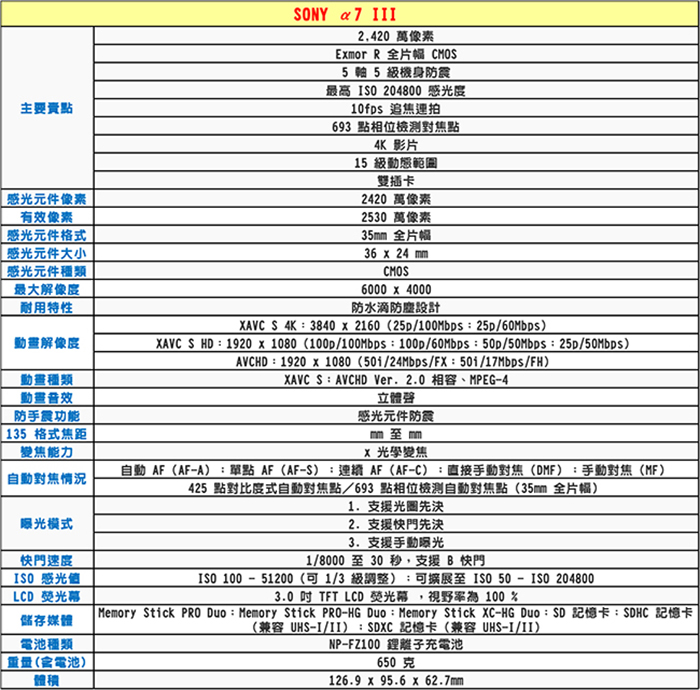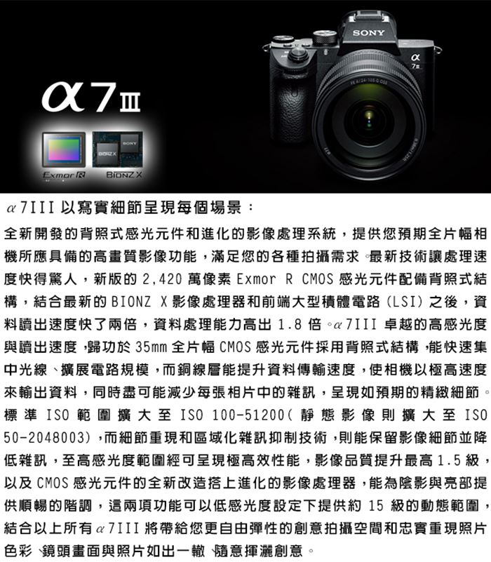 | 【內容物】 | A7III *1,FE28-70mm*1,原電*1,贈品128G卡x1、贈品專屬鋰電池*1、贈品專屬座充*1、贈品單眼雙鏡包*1,贈品大吹球*1 |
