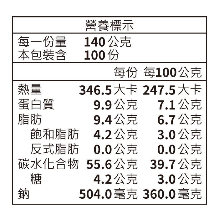 | 過敏原資訊 | 本產品含有麩質、大豆之穀物及其製品,不適合對其過敏體質者食用 |