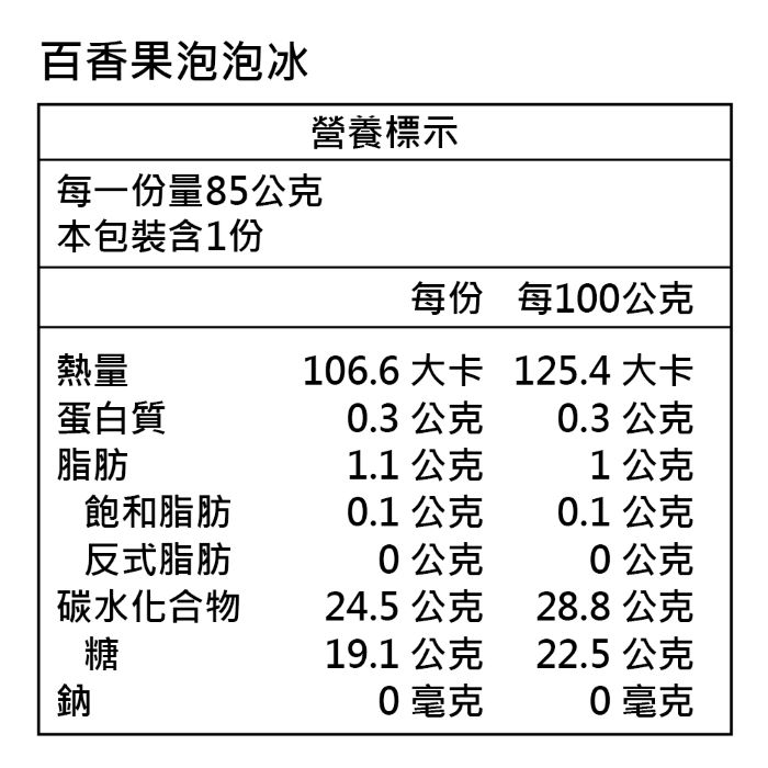 | 內容物(完整成份/食品添加物) | 水、百香果、砂糖、麥芽糖、檸檬、寒天 |