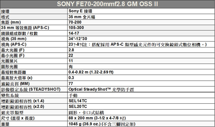FE 70-200mm F2.8 GM OSS II變焦鏡*(平行輸入) |