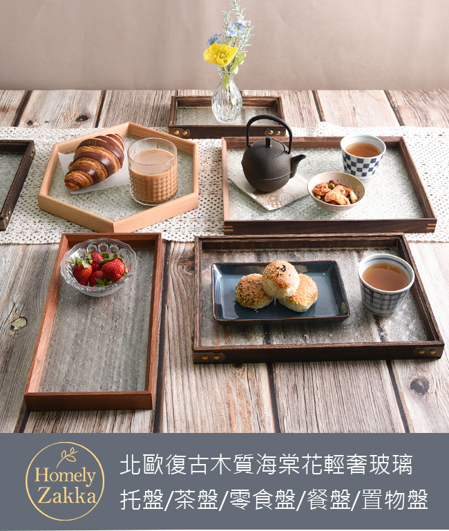 | 商品名稱 | 【Homely Zakka】北歐復古木質海棠花輕奢玻璃托盤/茶盤/零食盤/餐盤/置物盤_2款任選 |