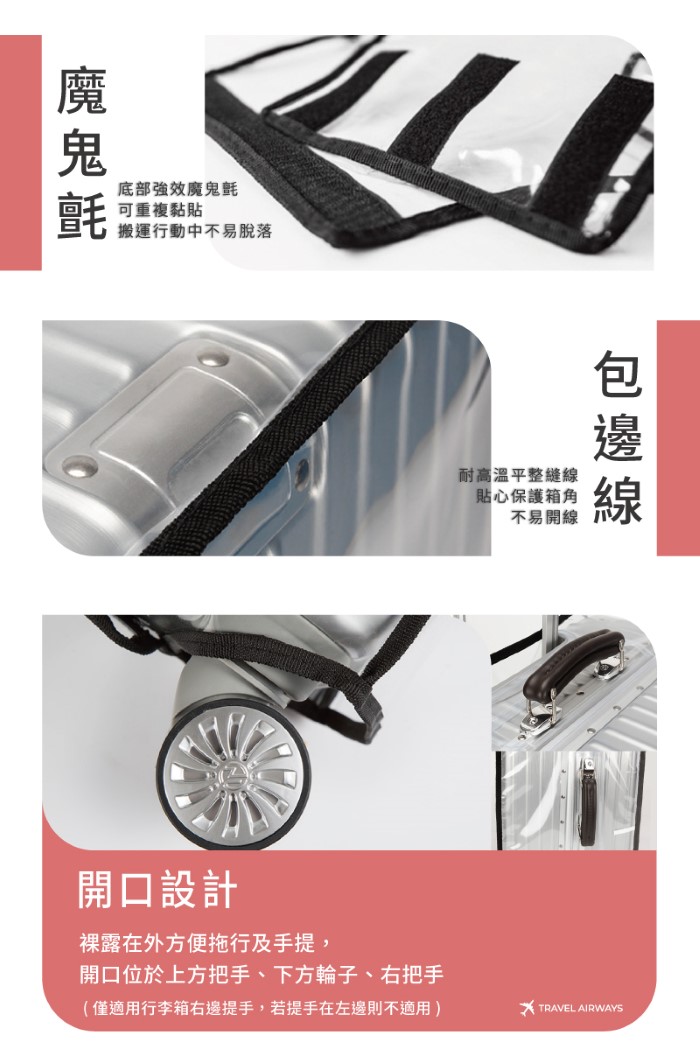 | 注意事項 | ◆ 產品顏色可能會因網頁呈現與拍攝關係產生色差,圖片僅供參考,商品依實際供貨樣式為準。 ◆ 此類商品如經拆封、使用、或拆解以致缺乏完整性,恕無法退貨! ◆ 下單前請確認尺寸表,因每款行李箱設計不同,尺寸相同不一定可以完美符合,建議參考實際數字再做下單。 ◆ 開口設計僅適用於行李箱右邊提手,若提手在左邊則不適用。 |